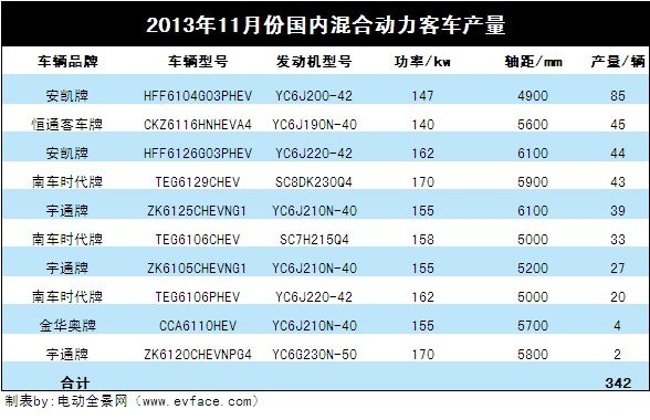 11月我國國內(nèi)混合動力客車產(chǎn)量342輛,其中油電混合動力客車225輛,氣電(非插電)混合動力客車70輛,插電式(氣電)混合動力客車47輛。由于對傳統(tǒng)混合動力客車的補貼暫未出臺,而且相較插電式