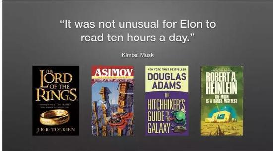 他在很小的時(shí)候就開(kāi)始自學(xué)了。他的兄弟 Kimbal 回憶說(shuō),Musk 經(jīng)常一天閱讀 10 小時(shí)左右的科幻小說(shuō),后來(lái)也看了很多的非科幻類(lèi)書(shū)籍。四年級(jí)之前,他就開(kāi)始堅(jiān)持不懈地閱讀大英百科全書(shū)。