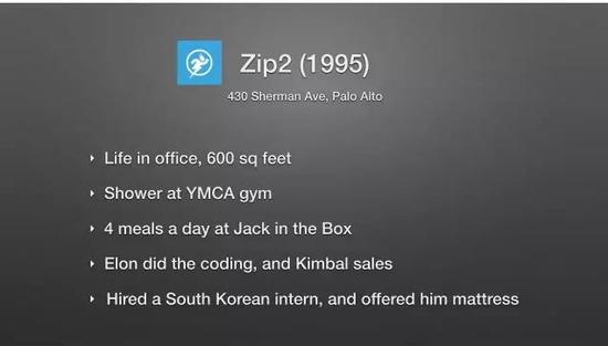 Musk 從默默無聞到聲名鵲起,是從和他一起來到美國的兄弟 Kimbal 合作開始的。他們一起開了第一家網絡公司 Zip2,一個幫助傳統媒體把內容和信息發布到互聯網上的平臺,其中包含黃頁和白頁功能,目標是幫助全國性的網絡媒體與地方商家合作,將產品地方化。因為預算很緊,Musk 和 Kimbal 及另一位朋友合租了一套公寓,就在公寓里辦公和睡覺,需要洗澡就去教會。作為首席程序員,Musk 不分晝夜地坐在電腦前工作。