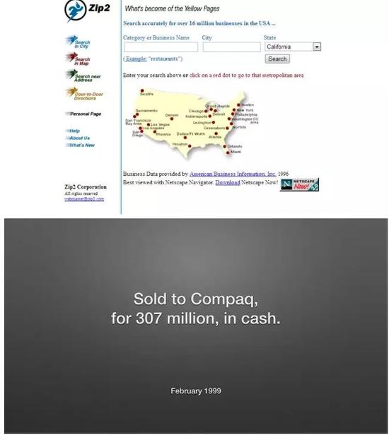 1999 年,康柏以 3.07 億美元收購了 ZIP2,也讓當時年僅 27 歲的 Musk 賺到了2200萬美金。
