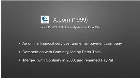 在 X.com 辦公的同一棟樓里,還有另一家叫 Confinity 的互聯網金融公司,創始人是如今大名鼎鼎的彼得·泰爾(Peter Thiel)和 Max Levchin。X.com 擁有快捷轉賬服務,后來 Confinity 也決定開發類似服務。兩家公司都開始注意到快捷轉賬服務的市場需求很大,這也使兩家公司之間的競爭愈發激烈,最終他們決定合并成一個公司,就是我們今天所熟知的 PayPal。