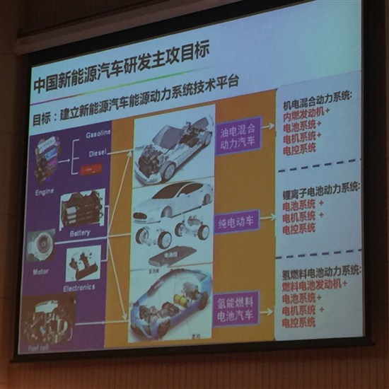 我們中國融入世界新能源汽車發展主流中創造適應中國交通體系的純電驅動技術特色的優勢是什么,我們把它分成三個區域。第一個區域就是形成小型電動車的特色,作為國民車;第二個區域,形成全電型插電式汽車,在有電的時候發動機是不工作的插電混合動力;第三個區域,形成電電混合的燃料電池特色,這是和豐田、本田不一樣的。他們的我們學不來,學了之后也沒法弄,我們走自己的路,這個就是戰略趨向。