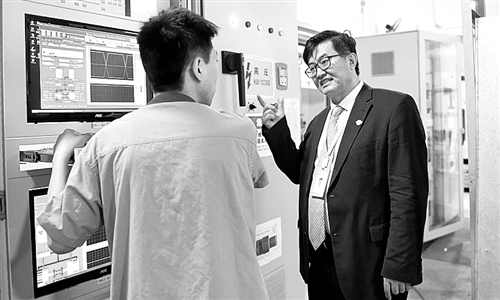 蔡蔚(右)在“精進(jìn)電動(dòng)”公司實(shí)驗(yàn)室內(nèi)與員工交流(5月17日攝)。