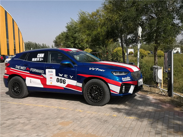 10月2日清晨,筆者按“線索”來到了天鵝湖風景區附近。其實在10月1日的下午,一輛??吭谔禊Z湖風景區里充電的VV7 PHEV已經引起筆者的注意——車身上赫然寫著“魏建軍B+”,很明顯這是一輛“戰車”。以魏建軍的行事風格,不會因為“凹造型”而特意設計一款比賽用車,既然它在這兒就說明一定有其“用武之地”。