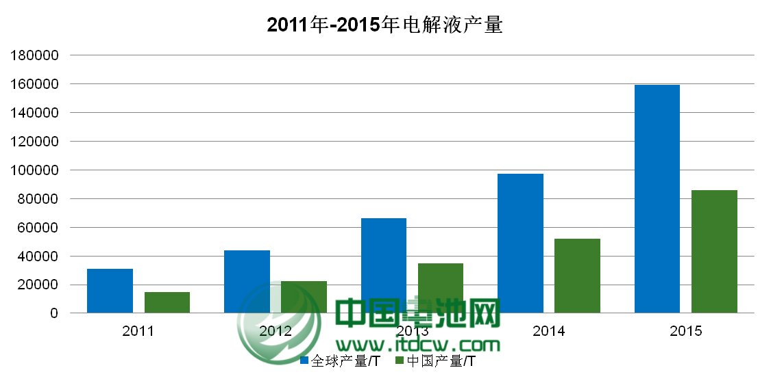 鋰離子電池市場的快速增長直接帶動了電解液材料產業的發展,從2003年起逐年增長,增幅大于20%;2012年電解液產量增幅最大,比去年增加51.0%。