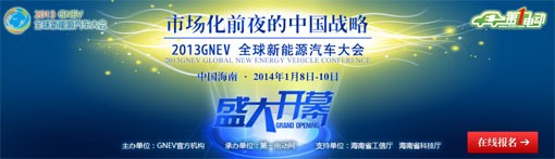 新政連連,鼓聲催人。9月中旬新一輪新能源汽車推廣政策出臺,11月底第一批28個新能源汽車推廣應用城市或區域名單出爐,各試點城市和區域正在制定各自的推廣方案。未來三年,各地將推廣超過30萬輛——新能源汽車無疑已經行至市場化前夜的最后階段。2014年1月8日-10日,2013全球新能源汽車大會將在海南海口市召開,主題即為“市場化前夜的中國戰略”,希望匯集全球數百位政府官員、企業高管和專家學者的智慧,為從業者貢獻經驗總結、前景預判和發展方略。(2013全球新能源汽車大會官網:http://www.d1ev.com/2013gnev/ 網上報名通道:http://www.d1ev.com/2013gnev/baoming.htm)