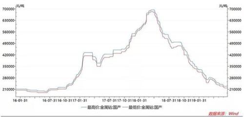 據WIND顯示,目前國內金屬鈷的最新報價在21.8萬元/噸—22.8萬元/噸之間,較2018年4月份價格高點已經跌去近七成。申萬宏源研報中表示,目前鈷價已經貼近開采成本,除非出現極端用低價搶占市場的情況,已經跌無可跌。