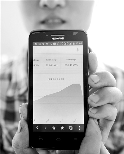 圖②:鄭州市上街區口頭村村民張海潤在自家房頂安裝的光伏發電設備通過了鄭州供電公司的檢測。現在他可以在手機上查看個人光伏發電系統的實時信息。