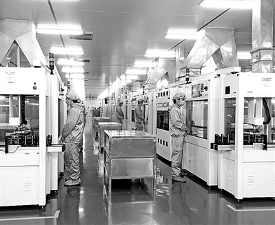 圖③:在英利的太陽能電池生產車間,員工們查看機器生產情況。