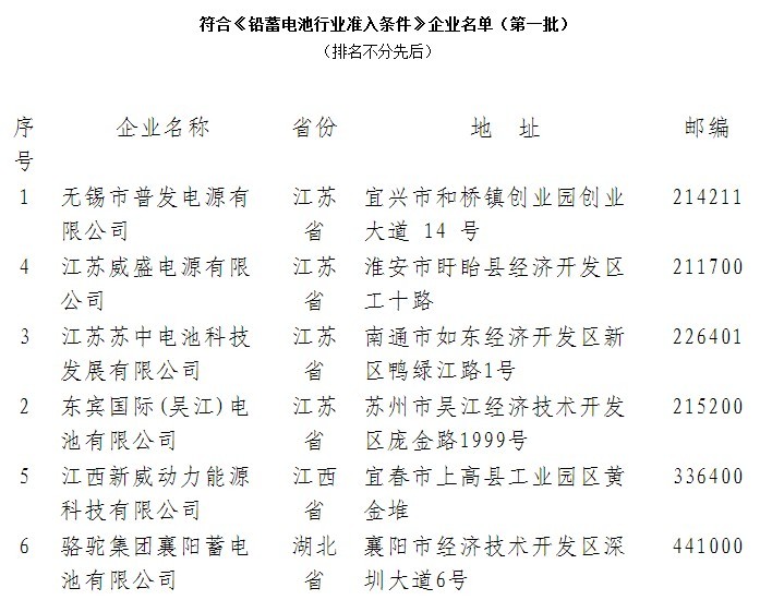 工信部網(wǎng)站9日消息,為推動鉛蓄電池行業(yè)可持續(xù)發(fā)展,依據(jù)《鉛蓄電池行業(yè)準入條件》,工業(yè)和信息化部、環(huán)境保護部開展鉛蓄電池企業(yè)準入管理。駱駝集團襄陽蓄電池有限公司等6家企業(yè)符合《準入條件》。