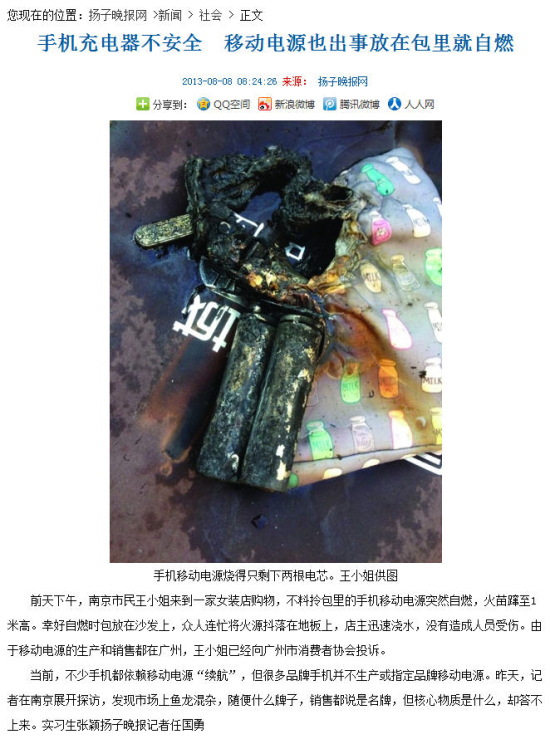 《揚(yáng)子晚報》在8月6日報道:南京市民王小姐來到南京一家女裝店內(nèi)購物,她將拎包放在沙發(fā)上,坐在一旁歇息。突然,王小姐聽到包內(nèi)發(fā)出“噗嗤”一聲響,隨后拎包還抖了一下。打開一看,王小姐發(fā)現(xiàn)1個月前買的手機(jī)移動電源有些鼓脹,一摸還很燙手。那一刻,王小姐意識到移動電源可能會自燃,便用紙巾捏住電池準(zhǔn)備拿出來。就在她取出移動電源的瞬間起火了。她迅速將電源抖落在地,但是火苗已經(jīng)將拎包燒出一個大窟窿。王小姐心有余悸地告訴記者,當(dāng)時電池躥出的火苗最高約1米,噴濺到人身上肯定會被灼傷。當(dāng)時服裝店內(nèi)煙霧彌漫,焦糊味刺鼻。電池外殼幾乎燒光,留下兩根電芯。再一看,沙發(fā)被熏黑了,地板留下一塊電池形狀的深深烙印。