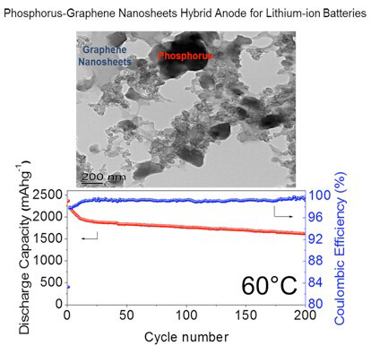針對這一問題,最近美國賓夕法尼亞州立大學(The Pennsylvania State University)王東海教授領導的,以于昭新、宋江選為主的科研梯隊發明了一種新型鋰離子電池負極材料:“紅磷-石墨烯”納米復合材料。該種材料是由紅磷和石墨經球磨制備得到。紅磷化學穩定性高,廉價易得,而且環境友好。其作為鋰離子電池負極材料的理論容量可達2600 mAh/g,7倍于商用石墨電極。 石墨/石墨烯因其極高的電子電導率被引入到該體系中以提升納米復合材料整體的電子電導率。在高速球磨過程中,微米級的紅磷顆粒被打碎至納米級。石墨在球磨 過程中剝離為大比表面積的石墨烯。經過長時間機械力作用,石墨烯相互搭接形成一個緊密結合的三維導電網絡,而納米級紅磷顆粒均勻分散在該網絡中。紅外光譜 (Infrared Spectroscopy)測試顯示,紅磷和石墨烯以“磷-氧-碳 (P-O-C)”的化學鍵形式結合在一起,這又為該材料出眾的電池性能提供了保證。在室溫下,該納米復合材料的放電容量可達1400mAh/g,4倍于現行商用化鋰離子電池負極材料–石墨。 經過300周的循環,放電容量仍然能保持在60%以上。高溫環境(60°C)對于現行商用鋰離子電池仍是很大的挑戰。而該種材料,在60°C下,放電容量可進一步提升至1650mAh/g。經過200周循環,放電容量保持率可在70%以上。