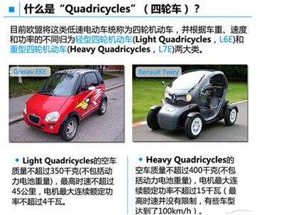 據(jù)歐盟規(guī)定,輕型四輪機動車的空車質(zhì)量不超過350千克(不包括動力電池重量),最高時速不超過45公里,電機最大連續(xù)額定功率不超過4千瓦;而重型四輪機動車的空車質(zhì)量不超過400千克(不包括動力電池重量),電機最大連續(xù)額定功率不超過15千瓦(最高時速并沒有限制,有些達到了100km/h)。