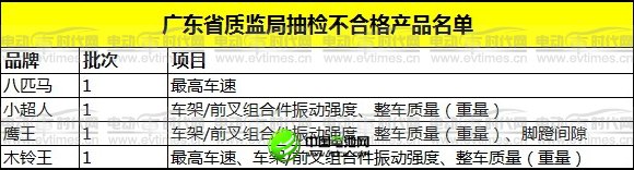 2013年1月,廣東省質(zhì)監(jiān)局公布了2012年對省內(nèi)10個地區(qū)40家企業(yè)生產(chǎn)的40批次電動自行車產(chǎn)品進(jìn)行了抽檢,檢驗不合格4批次,不合格產(chǎn)品發(fā)現(xiàn)率為10.0%。抽查依據(jù)GB17761-1999《電動自行車通用技術(shù)條件》及經(jīng)備案的企業(yè)標(biāo)準(zhǔn)或產(chǎn)品明示技術(shù)要求,對電動自行車產(chǎn)品的最高車速、制動性能、車架/前叉組合件振動強(qiáng)度、整車質(zhì)量(重量)、把立管靜負(fù)荷、腳蹬間隙、鞍座調(diào)節(jié)夾緊強(qiáng)度、絕緣性能、制動斷電裝置、欠壓過流保護(hù)功能等10個項目進(jìn)行了檢驗。不合格產(chǎn)品涉及到最高車速、車架/前叉組合件振動強(qiáng)度、整車質(zhì)量(重量)、腳蹬間隙、鞍座調(diào)節(jié)夾緊裝置、制動斷電裝置等項目。