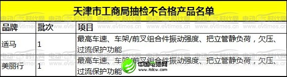 2012年11月,天津市濱海新區(qū)工商局在流通領(lǐng)域?qū)?biāo)稱天津市10家企業(yè)生產(chǎn)的10個批次電動自行車開展質(zhì)量監(jiān)測。依據(jù)GB17761-1999《電動自行車通用技術(shù)條件》及經(jīng)備案現(xiàn)行有效的企業(yè)標(biāo)準(zhǔn)和產(chǎn)品明示質(zhì)量要求。重點檢測了最高車速、制動性能、車架/前叉組合件振動強(qiáng)度、整車質(zhì)量、把立管靜負(fù)荷、腳蹬間隙、鞍座調(diào)節(jié)夾緊強(qiáng)度、絕緣性能、制動斷電裝置、欠壓、過流保護(hù)功能等10項指標(biāo)。主要問題是2個批次最高車速、2個批次車架/前叉組合件振動強(qiáng)度、2個批次把立管靜負(fù)荷、2個批次欠壓、過流保護(hù)功能指標(biāo)不合格。