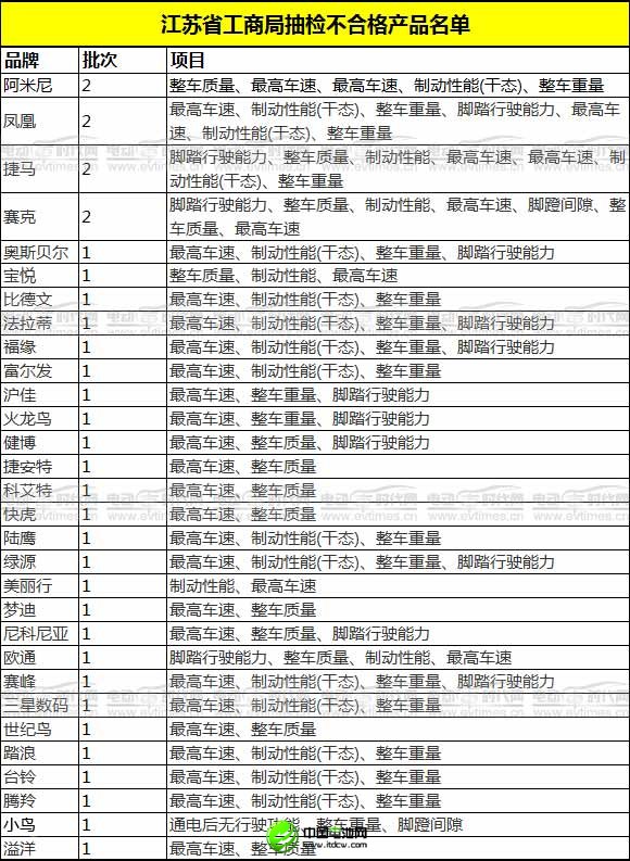 2012年3月,江蘇省工商局通報了2011年電動車商品質(zhì)量監(jiān)測結(jié)果,有34批次商品被查不合格。其中包括了鳳凰、踏浪、科艾特、阿米尼、火龍鳥、捷馬、尼科尼亞、世紀(jì)鳥、捷安特等多個品牌電動車。抽檢不合格的項目多集中在最高車速、整車質(zhì)量、整車重量、制動性能(干態(tài))和腳踏行駛能力等。