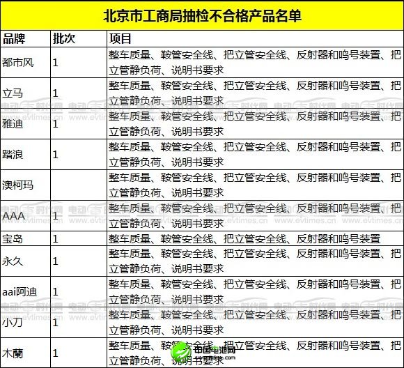北京市工商局去年11月通報了流通領域電動自行車商品質量監測結果,踏浪牌TDT01Z、永久牌TDR05Z等2個型號的電動自行車樣品總體判定為不合格商品,主要為最高車速、整車質量等項目不符合國家標準要求。監測中還發現,都市風牌TDR-100Z、澳柯瑪牌TDR286Z等11個型號的電動自行車整車質量大于40公斤,同時部分電動自行車樣品的鞍管安全線、把立管安全線、反射器和鳴號裝置、把立管靜負荷、說明書的要求等項目不符合國家標準要求。依據北京市政府有關規定,這11個型號的電動自行車已從北京市電動自行車產品目錄中刪除。
