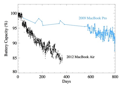 他的記錄結果如圖1所示,電池容量以非常快的速度減少。但這還不是最令人驚奇的事。達文波特對他的2009 MacBook Pro也繪制了曲線,顯示出電池衰減速度異常驚人。