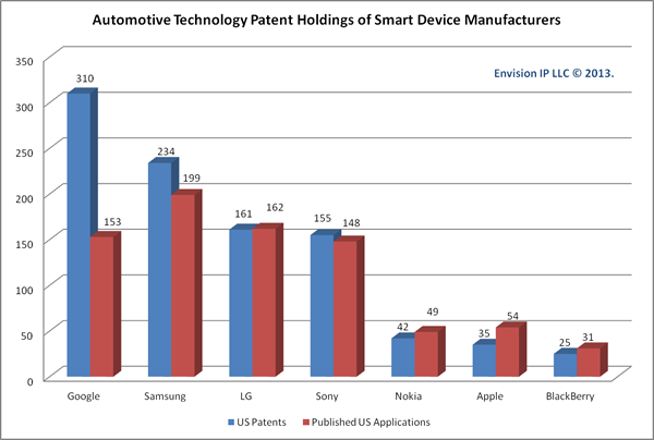 根據(jù)專業(yè)機構(gòu)Envision-IP分析統(tǒng)計,目前谷歌、三星電子、LG電子、索尼、諾基亞、蘋果和黑莓都已經(jīng)獲得了大量和汽車有關(guān)的專利,顯示在智能汽車和混合/電動汽車的發(fā)展中,科技公司可能已經(jīng)超越汽車廠商成為主角。