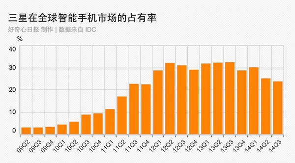 僅僅一年前,三星還是手機(jī)業(yè)的奇跡。這家公司2010年才真正進(jìn)入智能手機(jī)市場,兩年之后它便超過諾基亞、黑莓、蘋果、HTC等先行者,成為全球最大的智能手機(jī)廠商。到2013年,智能手機(jī)的幾乎全部利潤都被蘋果和三星兩家公司瓜分。