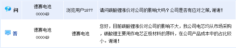 公司稱,公司電芯均從市場采購,碳酸鋰主要用作電芯正極材料的原料,在公司產(chǎn)品成本中的占比較小。
