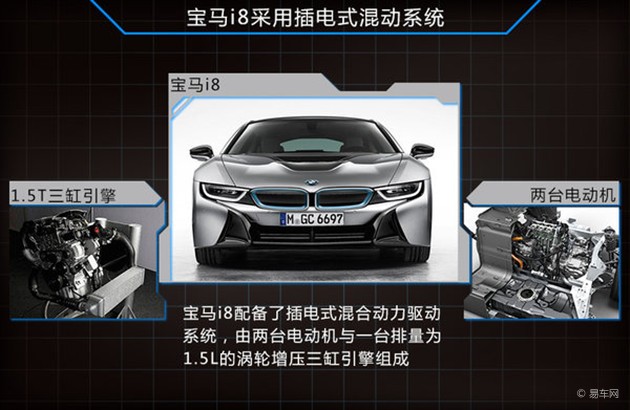 在目前寶馬i系列品牌中,寶馬i3被定義為一款小型車,而寶馬i8的定位則是超級跑車。寶馬i8不但擁有科技感十足的外觀,同時其具有超低的油耗,與現(xiàn)有的其他品牌超級跑車形可以說形成鮮明對比。根據(jù)寶馬此前公布的信息,寶馬i8配備了插電式混合動力驅(qū)動系統(tǒng),由兩臺電動機與一臺排量為1.5L的渦輪增壓三缸引擎所組成。其中1.5T引擎的最大功率為100千瓦,而使用eDrive技術(shù)電動機,最大功率為164千瓦。在純電動驅(qū)動下,寶馬i8的百公里加速僅為4.6秒,同時可行駛約32公里。此外值得一提的是,寶馬i8的油耗僅為2.5L,在超級跑車細(xì)分市場中,油耗表現(xiàn)非常具有優(yōu)勢。