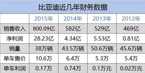 3月29日,比亞迪汽車公布了其2015年度財務數據,財報顯示,公司去年實現營業收入800.09億元,同比增長37.48%;凈利潤為28.23億元,同比增長551.28%。這個數據已經在今年2月與讀者見過一面,即便是利潤5倍的暴漲,但此刻看到也不覺驚奇了。