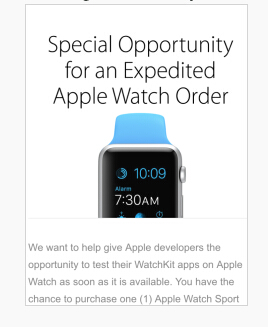 郵件稱,此次活動預留產品數量有限,打算購買Apple Watch開發人員需在太平洋時間4月23日上午10點前,通過蘋果開發者門戶進行注冊,4月23日當天即會顯示訂單交付狀態。