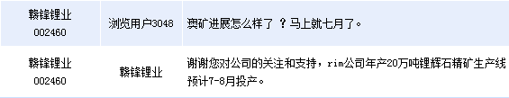 贛鋒鋰業(002460)周二在全景網互動平臺上表示,RIM公司年產20萬噸鋰輝石精礦生產線預計7-8月投產。