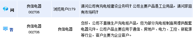 良信電器(002706)周三在全景網(wǎng)互動平臺上表示,公司不直接生產(chǎn)充電樁產(chǎn)品,但為部分充電樁制造商提供配套電器元件。