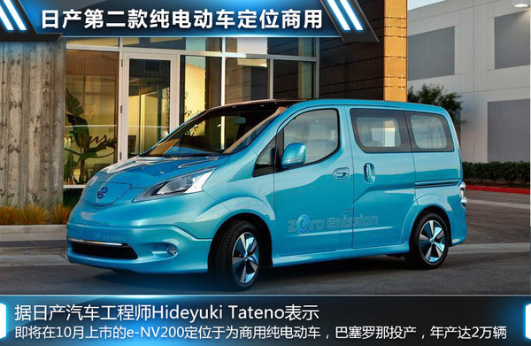 日產汽車對新能源解決方案的研發包括混合動力、燃料電池以及對傳統內燃發動機燃油經濟性的改造。但是未來純電動車將是其新能源戰略的首選,包括即將推出的e-NV200在內,目前日產總共推出了兩款純電動車。日產聆風為五門五座掀背轎車,市場定位于家用轎車,其在完全充電情況下可實現160公里以上的巡航里程,而即將在10月上市的e-NV200定位于為商用純電動車。據日產汽車工程師Hideyuki Tateno介紹,e-NV200將在日產西班牙的巴塞羅那工廠進行投產,年產量可達2萬輛以上。