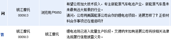 錢江摩托(000913)周五在全景網互動平臺上表示,公司鋰電池現已進入批量生產階段。