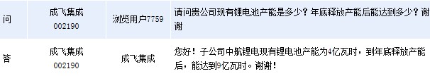 近日成飛集成(002190)在全景網互動平臺上表示, 子公司中航鋰電現有鋰電池產能為4億瓦時,到年底釋放產能后,能達到9億瓦時。