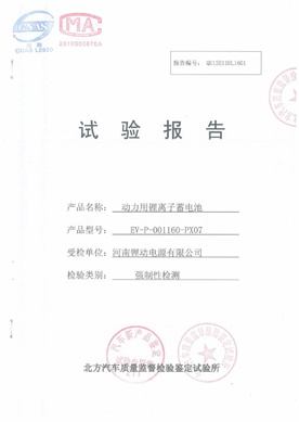 10月,河南鋰動電源有限公司生產的貧液態、軟包裝、疊片式動力軟包電池,在經過各項破壞性測試后,安全性能優秀,成功獲取北方汽車質量監督檢驗鑒定試驗所發放的160h及180Ah動力用鋰離子電池模塊的檢驗報告。進一步增強了河南鋰動電源有限公司針對新能源汽車領域產品的多樣性。