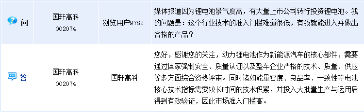 國軒高科(002074)周二在全景網(wǎng)互動平臺上回答投資者提問時介紹,動力鋰電池作為新能源汽車的核心部件,需要通過國家強制安全、質(zhì)量認證以及整車企業(yè)嚴格的技術(shù)、質(zhì)量、供應(yīng)等多方面綜合資格評審。