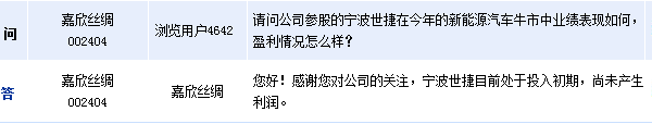 嘉欣絲綢(002404)周五在全景網(wǎng)互動(dòng)平臺(tái)表示,子公司寧波世捷新能源科技有限公司目前處于投入初期,尚未產(chǎn)生利潤(rùn)。