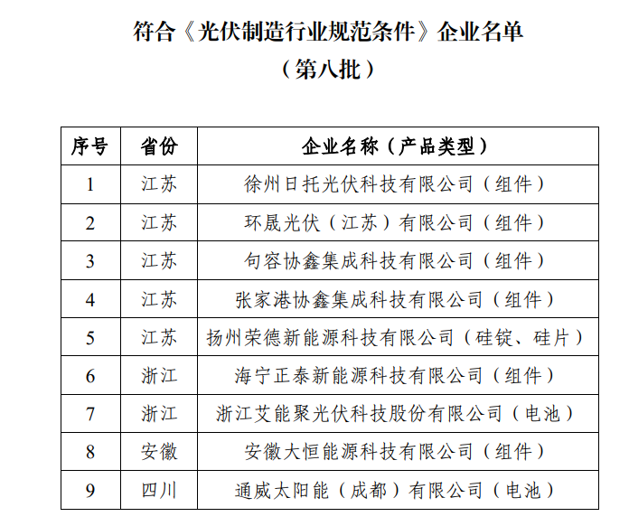 確定符合《光伏制造行業規范條件》企業名單(第八批)、撤銷光伏制造行業規范公告企業名單(第三批),現予以公告。