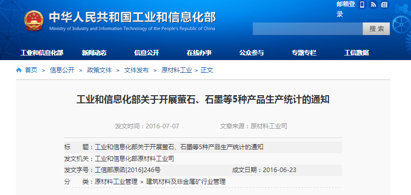 工信部關(guān)于開展螢石及石墨等5種產(chǎn)品生產(chǎn)統(tǒng)計的通知