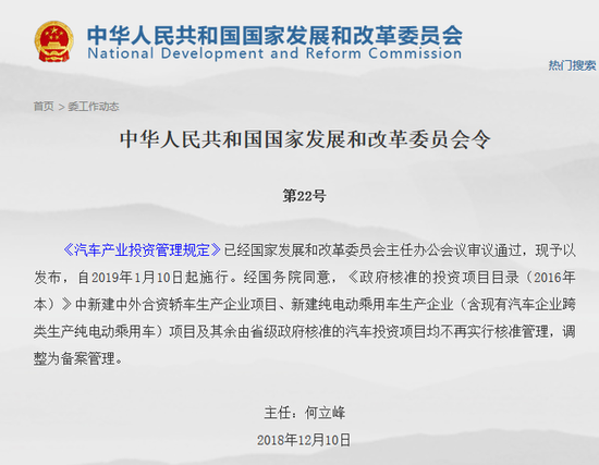 汽車產(chǎn)業(yè)投資管理規(guī)定發(fā)布 新建合資與純電動汽車項(xiàng)目改備案管理
