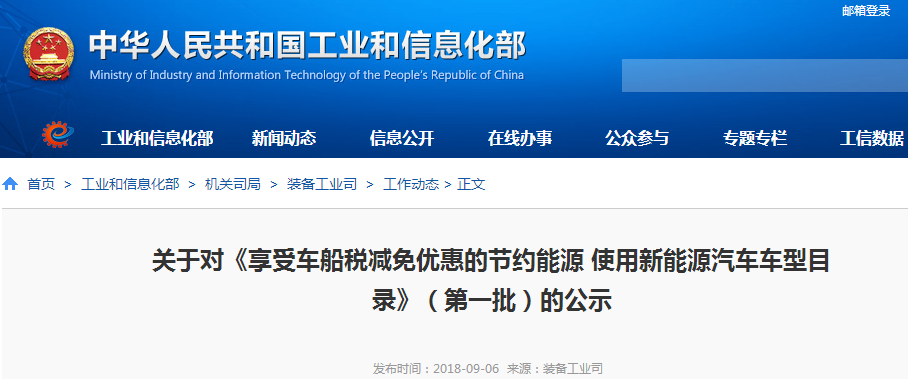 工信部公示首批享受車船稅減免優惠的新能源汽車目錄