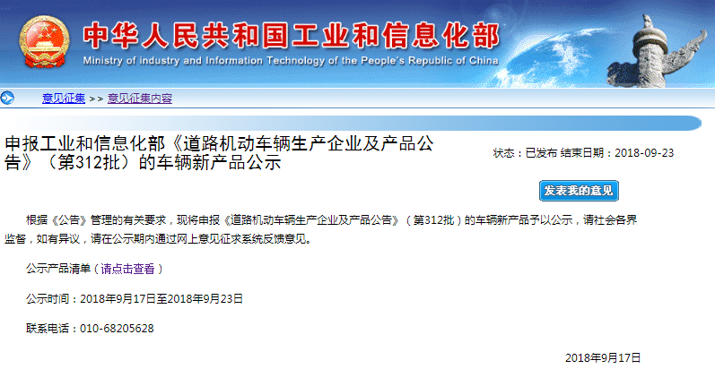 工信部公示申報第312批 《道路機動車輛生產企業及產品公告》新產品