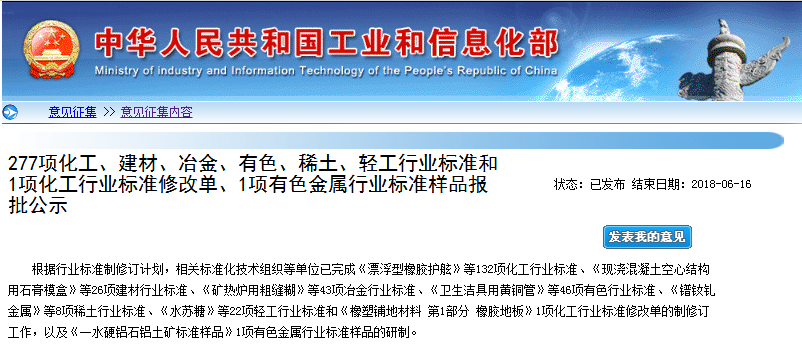 工信部:277項(xiàng)稀土、有色、化工等行業(yè)標(biāo)準(zhǔn)報(bào)批公示