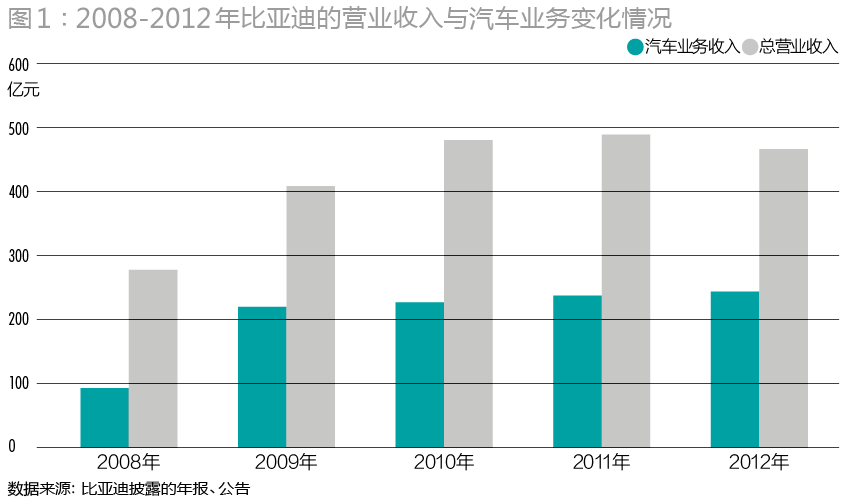 兵困汽車市場(chǎng),使比亞迪的經(jīng)營(yíng)陷入困局(表1)。2011年,比亞迪營(yíng)業(yè)收入僅同比增長(zhǎng)0.78%,營(yíng)業(yè)利潤(rùn)同比大幅下降49.04%,歸屬于上市公司股東的凈利潤(rùn)同比下降45.13%。資產(chǎn)收益率、每股收益創(chuàng)近三年新低,資產(chǎn)負(fù)債率攀升至近三年新高。2012年,由于汽車業(yè)務(wù)不景氣,加之手機(jī)代工業(yè)務(wù)也出現(xiàn)12.51%下滑,比亞迪當(dāng)年?duì)I業(yè)收入出現(xiàn)有史以來的負(fù)增長(zhǎng)(-4.04%)。