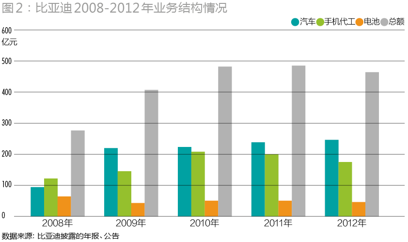 從業(yè)務(wù)結(jié)構(gòu)看,比亞迪一半是由電池業(yè)務(wù)和手機(jī)代工組成的非汽車業(yè)務(wù),另外一半則是汽車業(yè)務(wù)(圖2)。