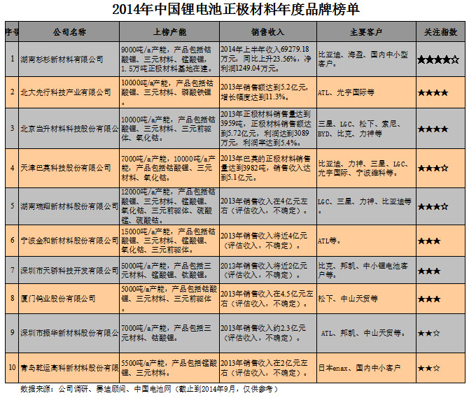 2014年中國鋰電池正極材料年度品牌榜單發(fā)布