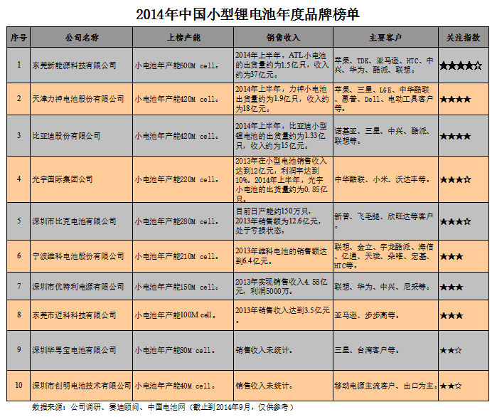 2014年中國小型鋰電池年度品牌榜單發(fā)布