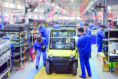 1月12日,在河南洛陽北方易初摩托有限公司,大批量大陽四輪低速電動車正在流水線上緊張裝配,陸續(xù)下線。據(jù)介紹,符合歐盟標(biāo)準(zhǔn)、具有節(jié)能環(huán)保優(yōu)勢的大陽四輪低速電動車自2013年8月問世打