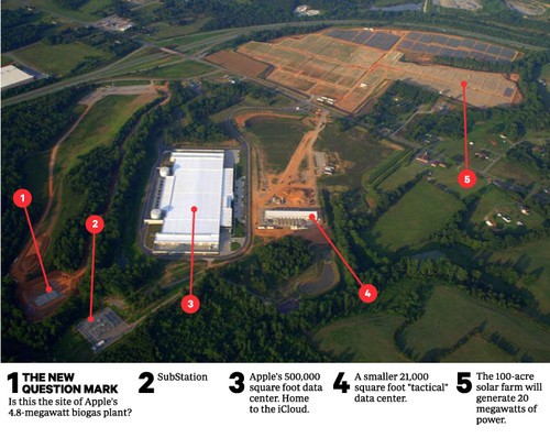 通過獲得的照片顯示該數(shù)據(jù)中心是一個大型的環(huán)保工程,我們可以看到左下角是一個4.8兆瓦的沼氣發(fā)電廠和一個變電站,中間最大 的建筑是蘋果的500000平方英尺的數(shù)據(jù)中心。緊鄰其旁邊的是一個較小的21000平方英尺的戰(zhàn)術(shù)數(shù)據(jù)中心。照片的頂部是100英畝的太陽能農(nóng)場,該太陽能農(nóng)場將能產(chǎn)生20兆瓦的電力。