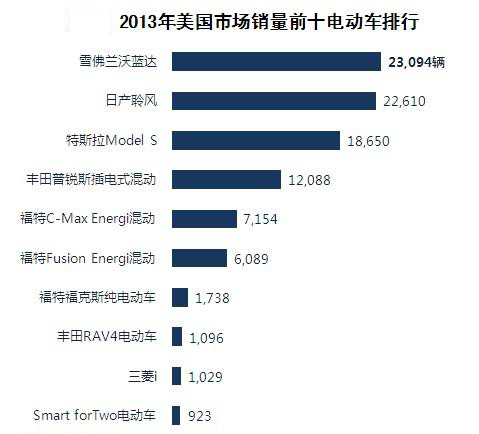 我們再看看世界汽車強國的美國市場,其2013年銷量前十電動車依次是通用汽車雪佛蘭沃藍達、日產聆風、特斯拉Model S、豐田普銳斯插電式混合動力車、福特C-Max Energi混合動力車、福特Fusion Energi混合動力車、福特福克斯純電動車、豐田RAV4電動車、三菱i和Smart forTwo電動車。其中,前六車型銷量均在6000輛以上,前三銷量更是均超我國新能源汽車總量,特斯拉銷量1.87萬輛。