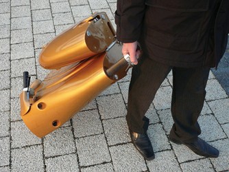 電動自行車由于有笨重的電池而令整車重量比較大,往往不便于攜帶。Moveo也較重,整車有25公斤。但是,它折疊后可以像拉桿箱那樣拖動,就十分方便人們隨身攜帶了。有了這樣的功能,人們可以把它隨意地帶上火車、地鐵,輕松地通過電梯帶入到辦公室或住宅內。人們還可以把它裝入到汽車后備箱,在抵達郊游目的地時啟用Moveo,可以達到汽車不能達到的區域,進行靈活自如的“慢游”。